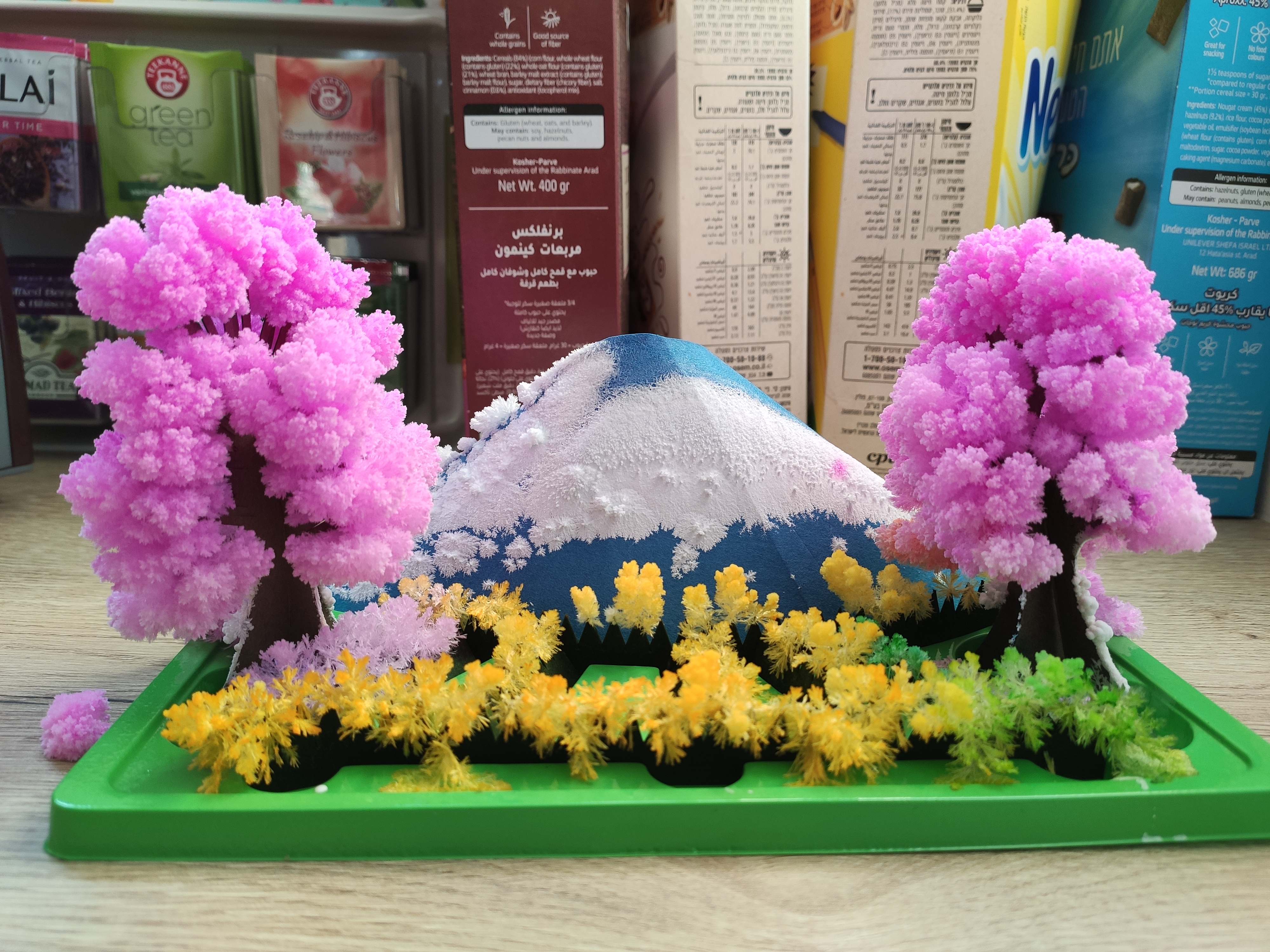 Подставка, в которую ставится деревянная фигурка: ее нужно облить приложенной жидкостью, после чего через один-два часа начнут расти "листья"-кристаллы, а за 24 часа обещают, что сакура вырастет целиком и получится что-то вот такое.