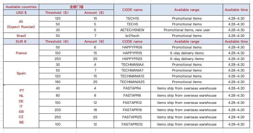 Промокоды до 30 апреля для Испании (в евро):