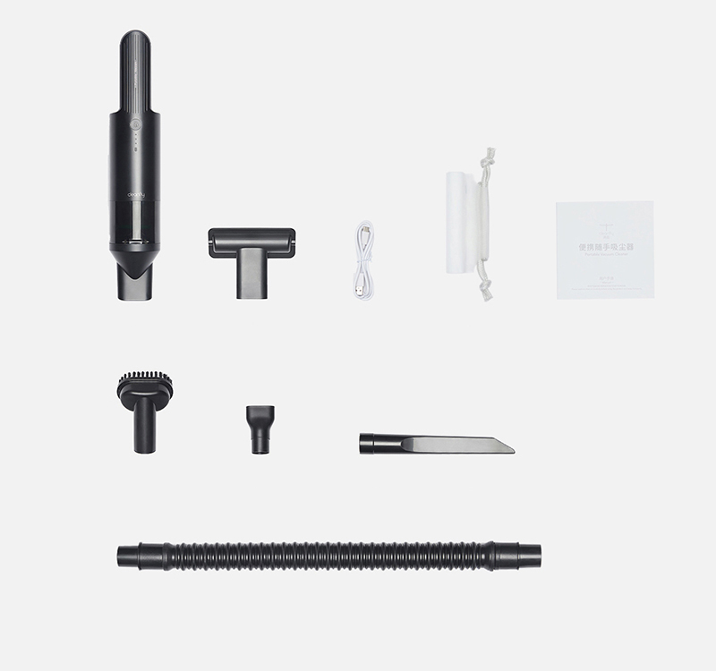 Комплект поставки: пылесос с HEPA-фильтром, адаптер для зарядки, кабель USB - Type-C, плоская насадка, насадка с щеткой.