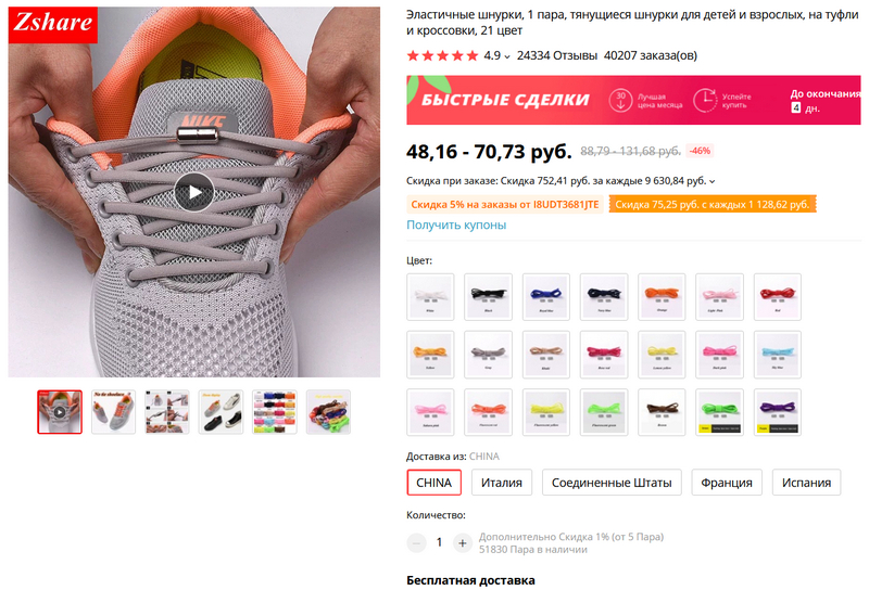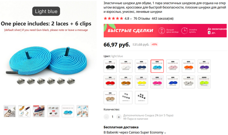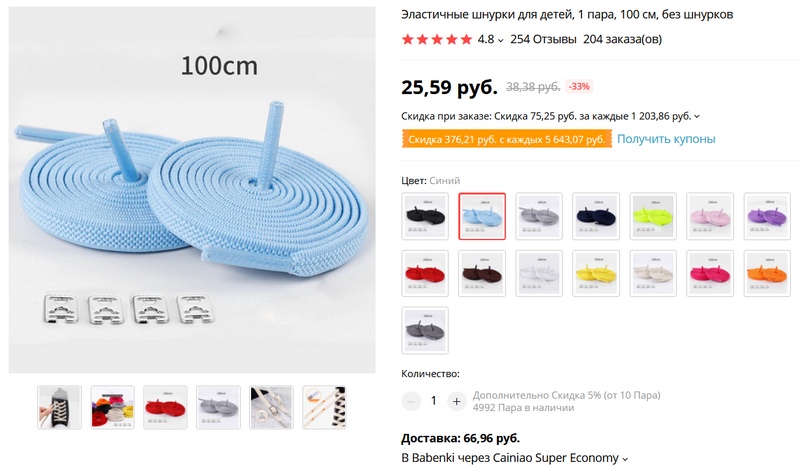 Вот это шнурки, которые использую я. Удобно то, что там аж 15 вариантов цветов! За доставку берут 67 рублей, но сами шнурки стоят 26, так что получается примерно столько же, сколько стоят аналогичные шнурки с бесплатной доставкой. Да, там почему-то написано "для детей" - не обращайте внимания, это обычные взрослые 100-сантиметровые шнурки. "Для детей" - видимо, потому что есть яркие расцветки.