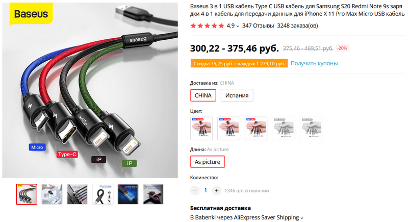 > зарядный кабель от Baseus - "3 в 1" и даже "4 в 1".