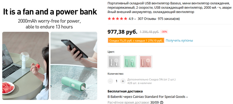 Компания Baseus выпустила забавную штуку "2 в 1": это и портативный автономный складной вентилятор, который от одного заряда может работать 13 часов, и очень компактный внешний аккумулятор на 2000 мА·ч.