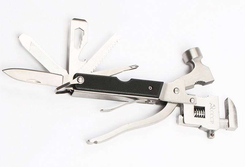 Комплектация: молоток, плоскогубцы, разводной ключ и набор обычных гаечных ключей, пилка и надфиль, нож, открывалка, крестовая и прямая отвертки, 2 биты и 7 торцевых головок.