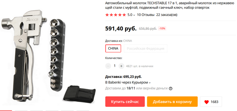 Молоток-мультитул "17 в 1". Стоит 1300 рублей (там еще доставка 700 рублей). Позиционируется как автомобильный, но наверняка пригодится не только в автомобиле.