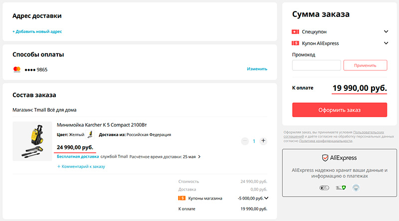 Нажимаю на "Хочу" у мини-мойки. В корзину она заносится по обычной цене - 24 990. Однако там доступны несколько купонов, я их набираю - и получаю аж 5000 рублей скидки, конечная цена, как и было обещано, 19 990 рублей.