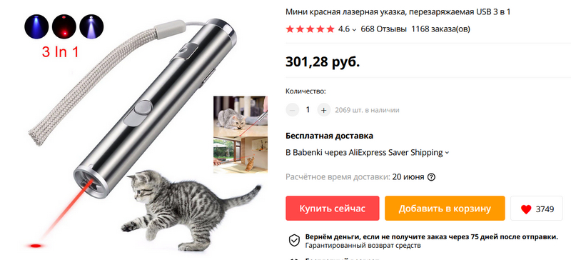 Лазерная указка "3 в 1" (красный лазер, ультрафиолет, фонарик) в стиле "Поиграй с котом". Владельцы хвалят за то, что она не на батарейках, как многие другие указки такого типа, а с аккумулятором, который заряжается через USB-порт.