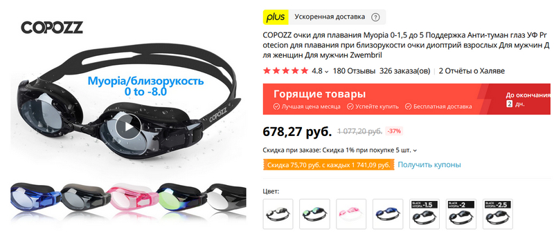 Любопытная штука - очки для плавания с диоптриями для близоруких: от -1,5 до -8.