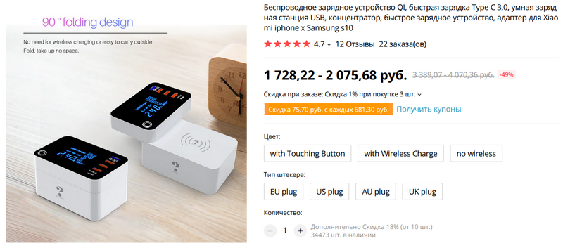 Интересная зарядная станция с большим дисплеем, на который выводятся параметры зарядки по всем портам. Поддерживает быструю зарядку QC 3.0, у нее четыре порта Type-A и один порт Type-C. Верхнюю часть станции можно повернуть на 90 градусов, под ней обнаружится беспроводная зарядка до 10 ватт.