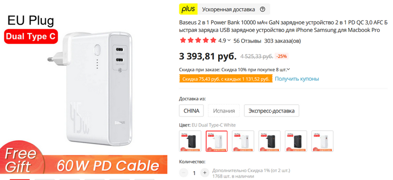 Компания Baseus выпустила универсальный двухпортовый (комплект портов можно выбрать) адаптер GaN (такие адаптеры сделаны из полупроводниковых элементов на основе нитрида галлия: они имеют меньшие габариты по сравнению с обычными кремниевыми, поддерживают быструю зарядку на нескольких портах одновременно, выдерживают высокие напряжения и не перегреваются, намного меньше греются) мощностью 45 ватт, то есть он может заряжать ноутбуки. Однако это одновременно еще и внешний аккумулятор на 10 000 мА·ч, то есть автономно он спокойно зарядит пару смартфонов. Меня заинтересовало, заказал. Там еще в комплекте кабель для быстрой зарядки.