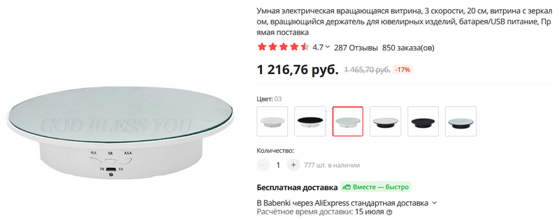 Это я искал для себя, но вдруг еще кому-то будет актуально - вращающаяся витрина с зеркальной поверхностью без подсветки. Есть несколько видов цвета поверхности.