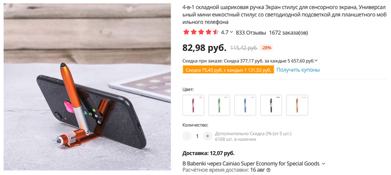 Забавная шариковая ручка различных цветов, которая может работать в качестве стилуса для экрана смартфона, а также может быть подставкой для смартфона. Плюс в ней еще есть фонарик. Но странно, что она не варит кофе.