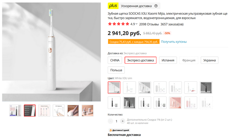 Новая модификация знаменитой электрической зубной щетки Xiaomi Mijia SOOCAS X3 (я только ее и использую последние несколько лет) - Xiaomi Mijia SOOCAS X3U. Четыре режима очистки. Есть экспресс-доставка за 5 дней, различные цвета, различные варианты комплектации (с чехлом для поездок, с запасными чистящими головками).