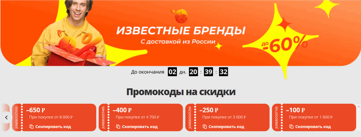 Всем привет. Один мой мелкий персональный промокод на сегодня есть: Exler250june. Он предоставляет скидку новым пользователям в 250 рублей при заказе от 750 рублей и активен с 1 июня с 10:00 по МСК по 30 июня или до конца количества активаций. Действие промокодов распространяется на заказы с доставкой в страны России и СНГ.