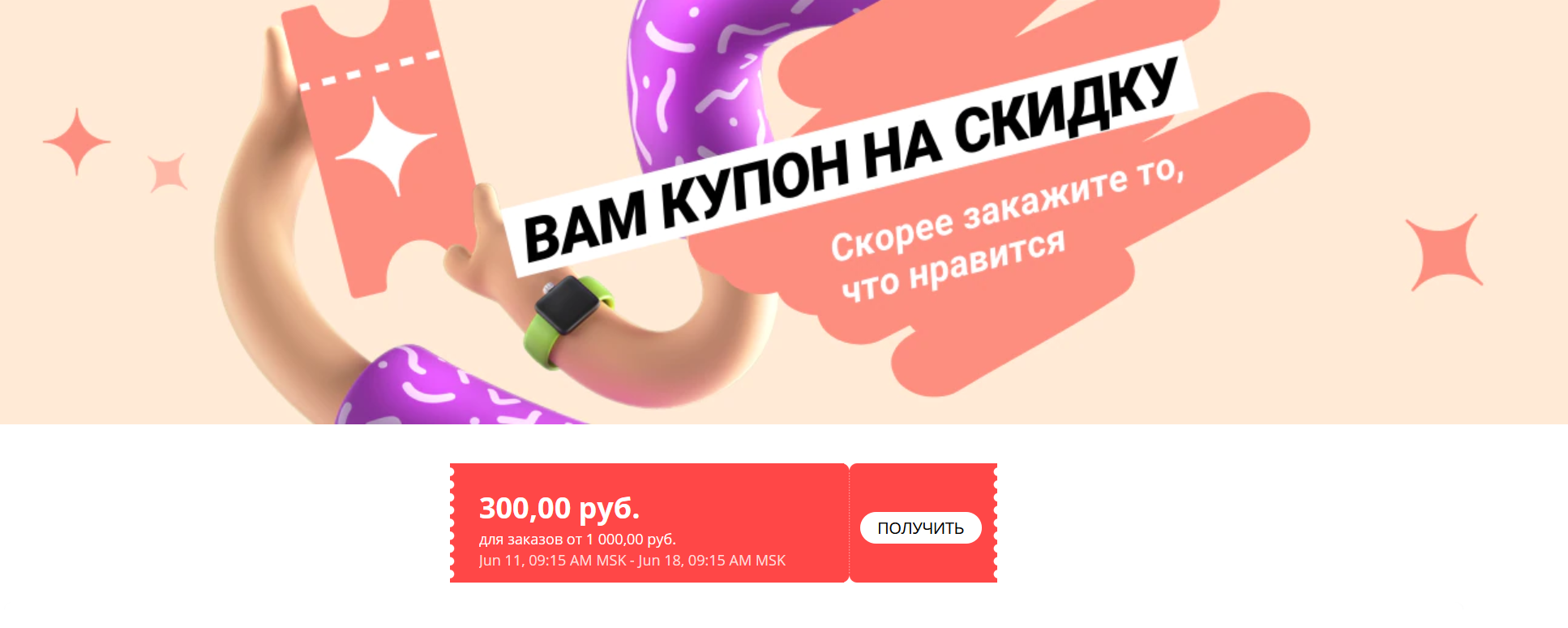 Появился специальный купон на 200/300р. для покупателей, кто не делал давно покупки и для новичков.