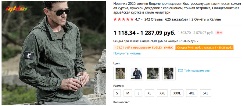 Как раз для лета: водонепроницаемая, быстросохнущая куртка-ветровка в стиле милитари. Есть капюшон, четыре вида расцветок, любые размеры. (При заказе, конечно, нужно сверяться с таблицей размеров, которая там приводится.)