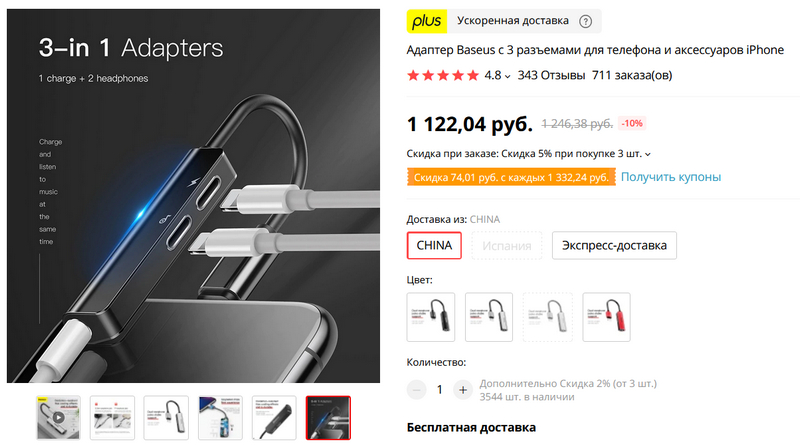 Для владельцев айфонов адаптер от Baseus "3 в 1". Это переходник под аудиоджек, который имеет также еще два порта Lightning, позволяющих смартфон с подключенными наушниками одновременно заряжать, а также закачивать на него данные. Полезная штука, на мой взгляд.