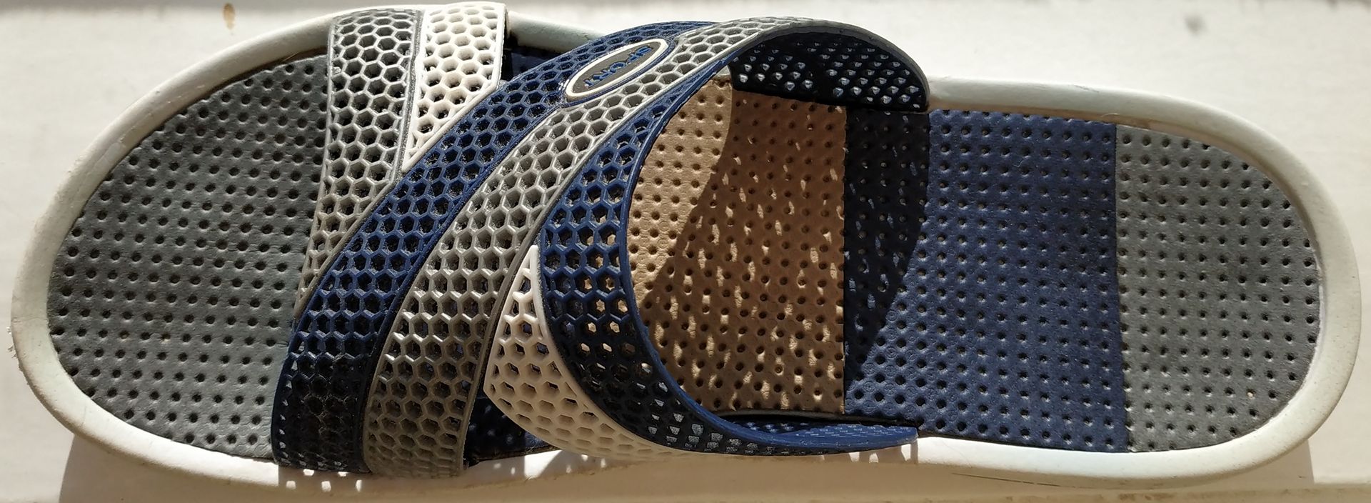 У кого есть волосатая лапа в Краснодарском крае: уже пару лет налажено местное производство таких недорогих шлёпанцев (2020 г. = 250 ₽). Снабдил всех друзей из М. и Тюмени. На фото - результат ежедневной эксплуатации 100 кг, 45 размер, как новые ~2 года, нога их материал (пластик) воспринимает нормально: