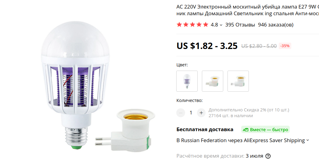 Заказал недавно, ещё в пути. Но я много лет использовал подобные устройства в Таиланде. У этой лампочки, как я понял, 2 (или 3?) режима, переключающихся включением-выключением: просто лампочка и ночник с "убийцей комаров". Принцип действия простой: комары и мошки привлекаются неярким источником света в центре устройства, но перед ним их встречают провода высокого напряжения (600-1000 вольт).