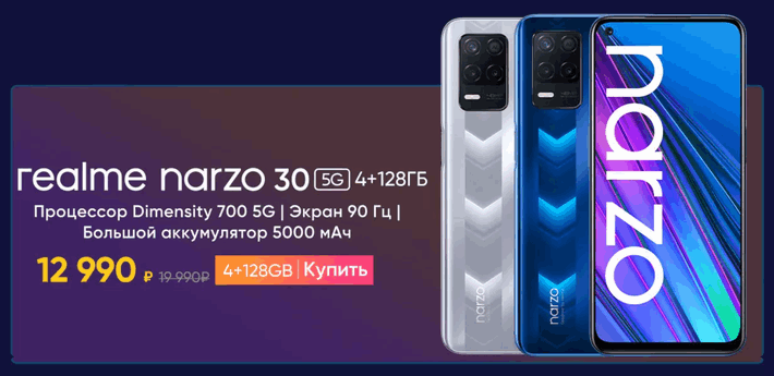 С 14 по 15 июня на площадке TMALL запуск новой модели realme narzo 30 5G 4+128Gb 5000 мАч