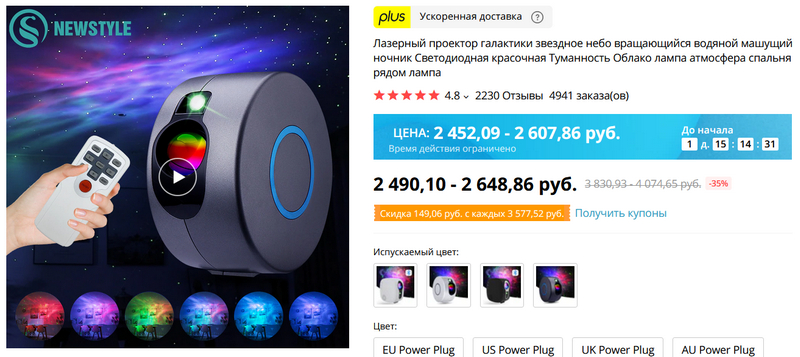 Проектор меняющегося звездного неба на потолок или на стену. Рекомендовали те, кто им пользуются: говорят, и самим нравится, и дети в восторге. Может использоваться и в качестве ночника, и для праздников, и для романтической вечеринки. Управляется с пульта, имеет семь вариантов цветовых оттенков. Закажу, пожалуй, люблю такие штуки.