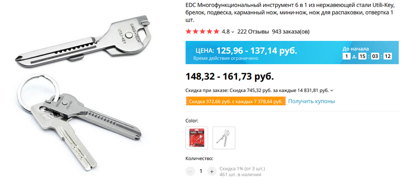Многофункциональный инструмент "6 в 1" из нержавеющей стали размером с обычный ключ. Может носиться вместе с остальными ключами, чтобы всегда быть под рукой и в нужный момент открыть бутылку, открутить винт, открыть посылку - и так далее. Говорят "must have". Ну must, так must - заказал. Пускай с ключами болтается.