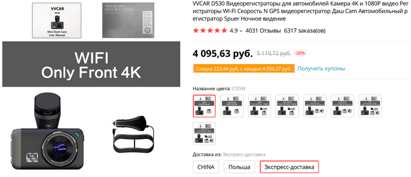 Недорогой видеорегистратор VVCAR D530 с реальным разрешением 4К (3840х2160), Wi-Fi и опционально - GPS, задней камерой FullHD и комплектом для круглосуточного мониторинга на парковке, причем видеорегистратор только с Wi-Fi стоит 4 тысячи рублей, а в полном комплекте - 7 тысяч. (При этом на eBay он продается за €120-130, а это 11 тысяч рублей.)