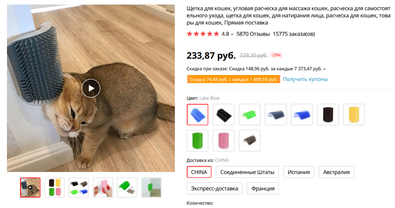 Полезная штука для кошатников - щетка-саморасческа. Крепится на углу стены, кошка об эту щетку сама трется, массируется и саморасчесывается. Не то чтобы после этого ее вообще не нужно расчесывать, но часть этой процедуры кошка берет уже на себя. У щетки под 6 тысяч отзывов, все сплошь положительные: купившие пишут, что их кошакам щетка очень понравилась.