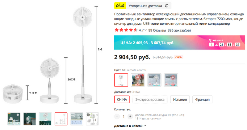 Любопытный складной вентилятор. В сложенном виде занимает всего 9 сантиметров по высоте, с полностью выдвинутой телескопической ножкой - 1 метр. Заряжается от USB, имеет четыре вида обдува, одного заряда хватает для работы в течение 5 часов, вентилятор может поворачиваться на угол в 90 градусов, есть лампа-ночник. Управляется кнопками, расположенными на подставке, можно также немного дороже купить вариант с пультом управления. Также может распылять воду для увлажнения воздуха.