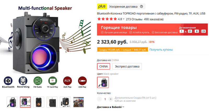 Многофункциональная колонка с сабвуфером и подставкой под смартфон/планшет. Есть пульт управления, FM-радио, поддерживаются карта памяти и воспроизведение с флешки через USB.