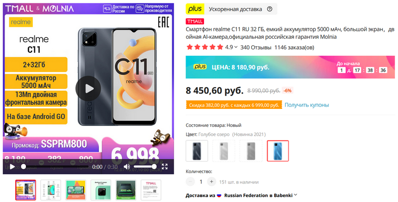 Цену на популярный бюджетный смартфон Realme C11 уронили уже до 6998 рублей - с купоном продавца и промокодом SSPRM800. Дисплей 6,5" IPS, оперативки 2/32, платформа MediaTek Helio G35, камера 13 Мпикс, аккумулятор 5000 мА·ч. Быстрая доставка с российского склада.