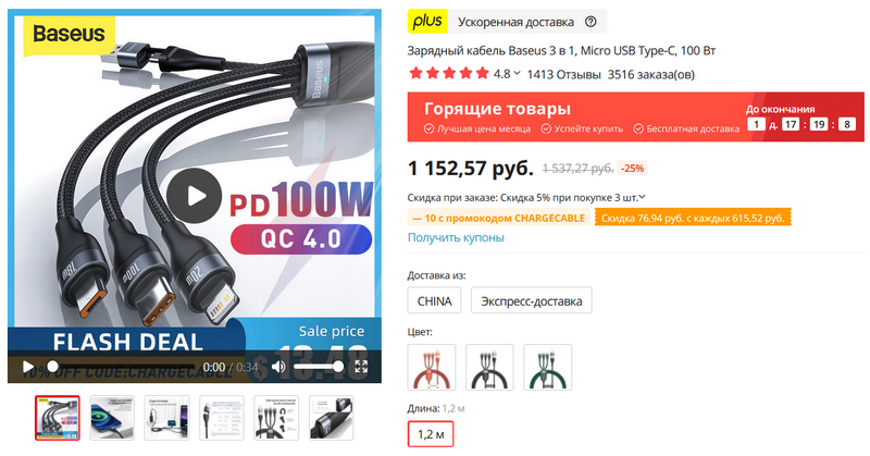 Проблема универсальных трехголовых кабелей для зарядки - в том, что они обычно не поддерживают быструю зарядку. А тут подсказали универсальный кабель от Baseus, который поддерживает PD 100 Вт и QC 4.0. Также у него есть переходник с Type-C на USB-A - для разных типов адаптеров.