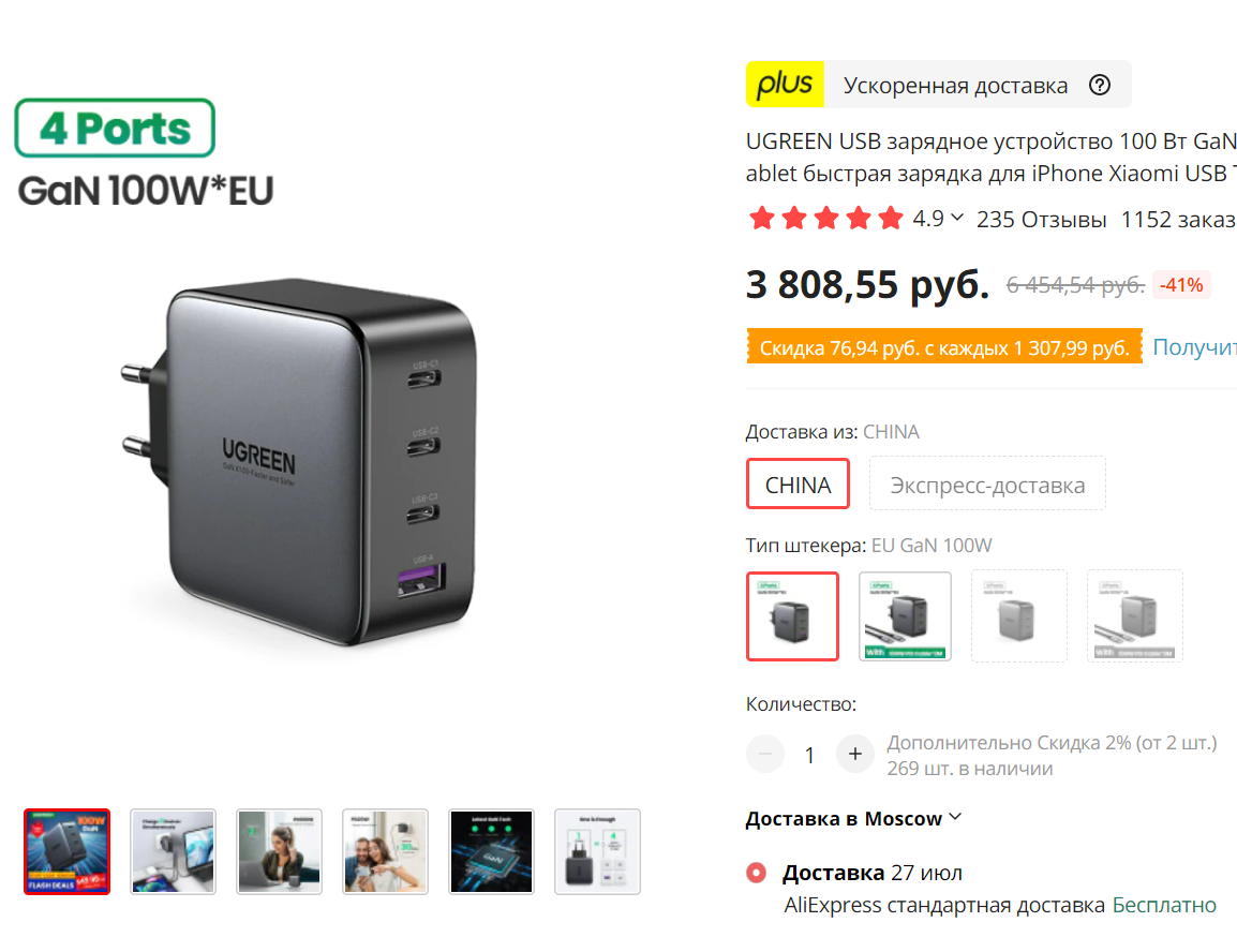 Акция на мощное и быстрое GaN зарядное устройство от UGREEN на 100W.