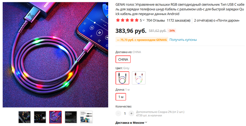Чего только не придумают! Зарядный кабель-дискотека. В кабель встроен микрофон, реагирующий на звук. Если на смартфоне играет музыка, то кабель в такт музыке сверкает огоньками различных цветов. Там есть ролик, можно посмотреть, как оно работает вживую. Если музыка не играет, кабель не светится, а работает обычным зарядным кабелем. Два варианта цветов - белый и серый.