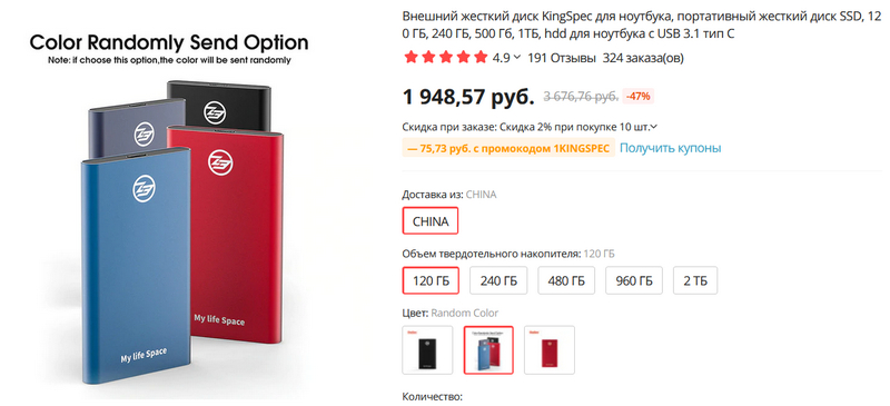 Вот несколько вариантов таких дисков разной емкости и разных цветов от известного производителя KingSpec.