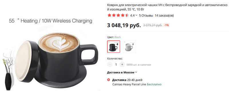 Как интересно придумано! Коврик со специальной чашкой с крышкой (есть черная и белая). Коврик может поддерживать в чашке температуру напитка в 55 градусов. (Понятно, что если коврик подключить к умной розетке, то его функциональность можно заметно расширить - например, подогревать напиток по расписанию.) Также коврик является 10-ваттной беспроводной зарядкой.