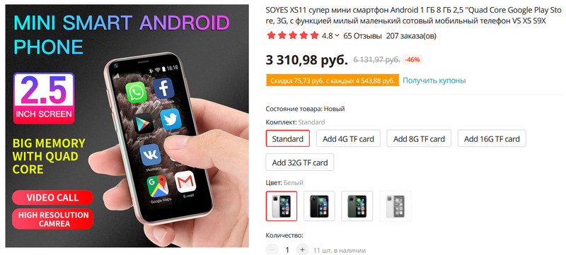 Кто просил очень маленький смартфон? Вот очень маленький смартфон - дисплей 2,5". Характеристики, конечно, очень скромные, ну а чего вы хотели за три тысячи рублей?