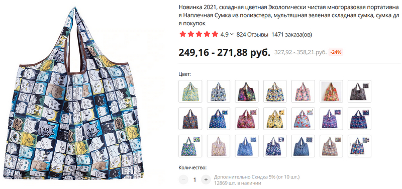 Что-то типа легендарной советской авоськи, которая в сложенном виде лежала в портфеле в виде маленького комочка, а в развернутом виде в нее можно было положить два больших арбуза. Здесь сумка подобного типа, но значительно удобнее и красивее. В сложенном виде места почти не занимает, в разложенном виде в нее помещается небольшой слон.