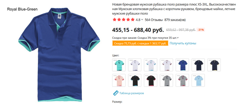Симпатичные мужские рубашки-поло разнообразных расцветок. Свой размер сверяйте по таблице размеров, которая там есть.