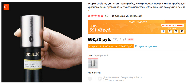 Незаменимая штука - крышка-помпа Xiaomi Youpin Circle Joy для недопитого вина: красного, розового, белого. Откачивает воздух в бутылке, препятствуя окислению вина (что особенно актуально для красного вина). На пробке можно выставить дату открытия бутылки, чтобы не забыть.