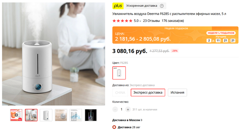 Прилично выглядящий увлажнитель воздуха с большой емкостью на пять литров. Доставка с российского склада. На распродаже обещают скидку, также попробуйте применить промокод WOWKISS350 - он вроде еще где-то на 400 рублей должен уменьшить цену.