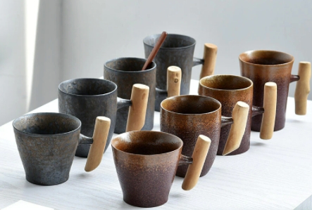 Очень стильная винтажная керамическая кружка с деревянной ручкой.