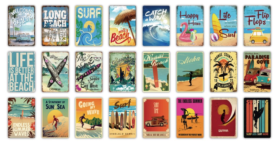 Зачетные алюминиевые таблички с винтажными и стилизованными рисунками на множество тем - пляж, музыка, фильмы, кухня, цветы, логотипы и др. В данной ссылке набор табличек пляжной тематики. У продавца есть возможность заказать табличку со своим собственным изображением.