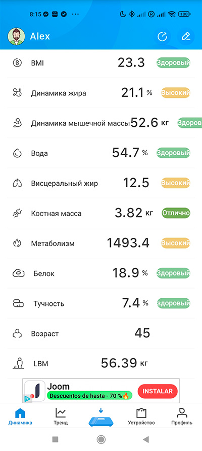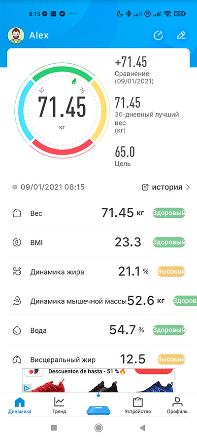При повторных измерениях сразу же после первого (проверка) все показывало один в один, ничего не плавало. В приложении данные сохраняются, хранятся в истории, ну и там показывается прогресс веса, жира и так далее. Профили пользователей тоже поддерживают, но не автоматически: чтобы занести данные измерения в другого пользователя, на него сначала нужно переключиться в приложении.