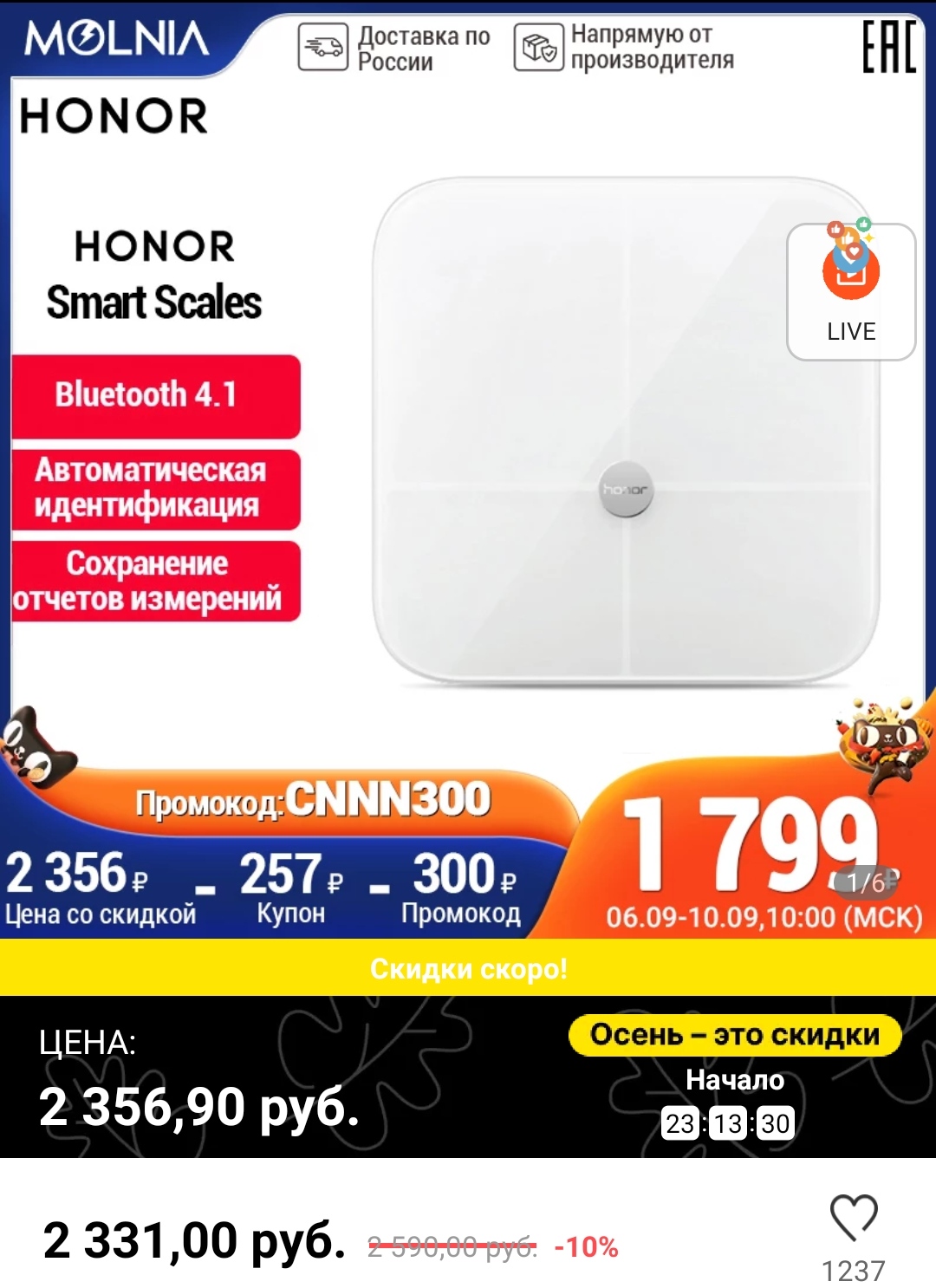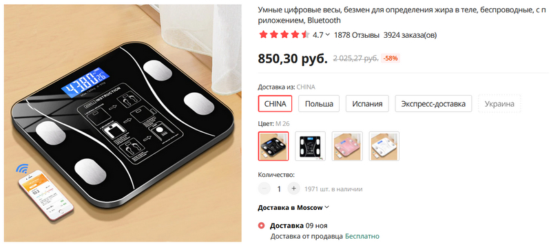 Попалась ссылка на реально дешевые умные весы, которые кроме веса измеряют тучу всяких параметров и сохраняют их в приложении. Есть четыре варианта цветов, и для черного варианта есть даже экспресс-доставка в Россию. Стоят они всего 850 рублей. Для сравнения, мои весы Withings стоят почти на порядок дороже - порядка 7500 рублей.