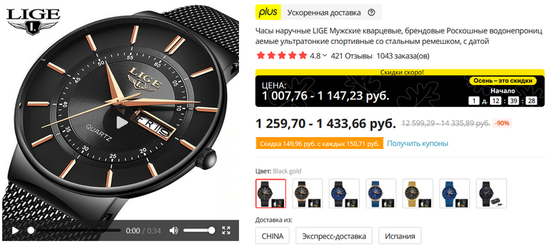 Для любителей обычных кварцевых часов: очень недорогие мужские часы от известного производителя LIGE. Я у них пару раз часы заказывал (выглядели уж больно эффектно, хотелось их пощупать самому, да и стоили они копейки) - совершенно не разочаровали.