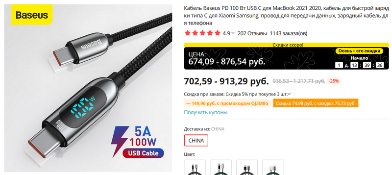 Первый раз такой класс вижу - зарядный кабель с дисплеем, на котором показывается мощность зарядки (именно мощность, а не амперы, что значительно более информативно). Там два размера (метр и два), два вида цветов и две версии: USB-C - USB-C на 100 ватт и USB-A - USB-C на 40 ватт. Я себе обе версии заказал, очень удобно.