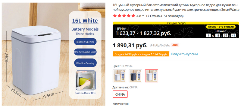 Страшно умное мусорное ведро на 12 или 16 литров, в которое можно стелить обычные мусорные пакеты. Крышка открывается по кнопке, по датчику движения (расстояние до 25 см), а также если ведро просто пнуть (отличная идея). Крышка открывается совершенно бесшумно, закрывается плотно (запахи не пропускает). В темноте еще и включается подсветка. Заказываю немедленно, я давно такое хотел для кабинета.