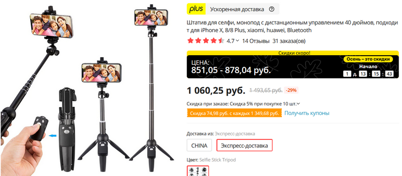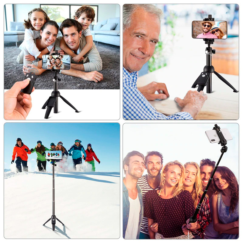 Очень полезное устройство для любителей селфи: селфи-палка, она же трипод с телескопической опорой, выдвигающейся до 101 см, есть пульт дистанционного управления, работающий по Bluetooth. Я подобный штатив использую много лет, но у меня устаревшая модель: данная новее и круче.