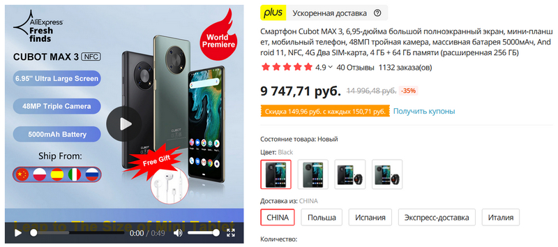 Компания Cubot выкатила мировую премьеру своего нового смартфона Cubot Max 3. Смартфон фактически сверхбюджетный, в районе 10 тысяч рублей, при этом за такие деньги комплектация прям интересная: здоровенный экран 6,95", платформа Mediatek Helio P22 MT6762, памяти 4/64 ГБ, камера 48 Мпикс, аккумулятор 5000 мА·ч. Есть экспресс-доставка.