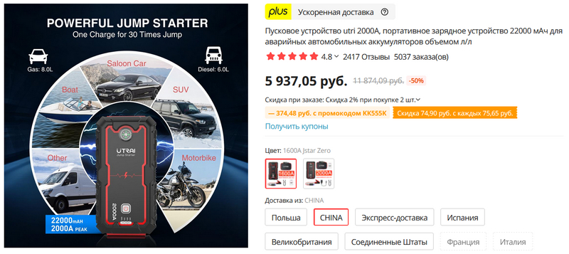 На эту штуку прислал ссылку читатель, который ее использует: пусковое устройство для севшего аккумулятора автомобиля, работающее при температуре воздуха до -20. Оно имеет емкость 22 000 мА·ч и обеспечивает пусковой ток до 2000 А.